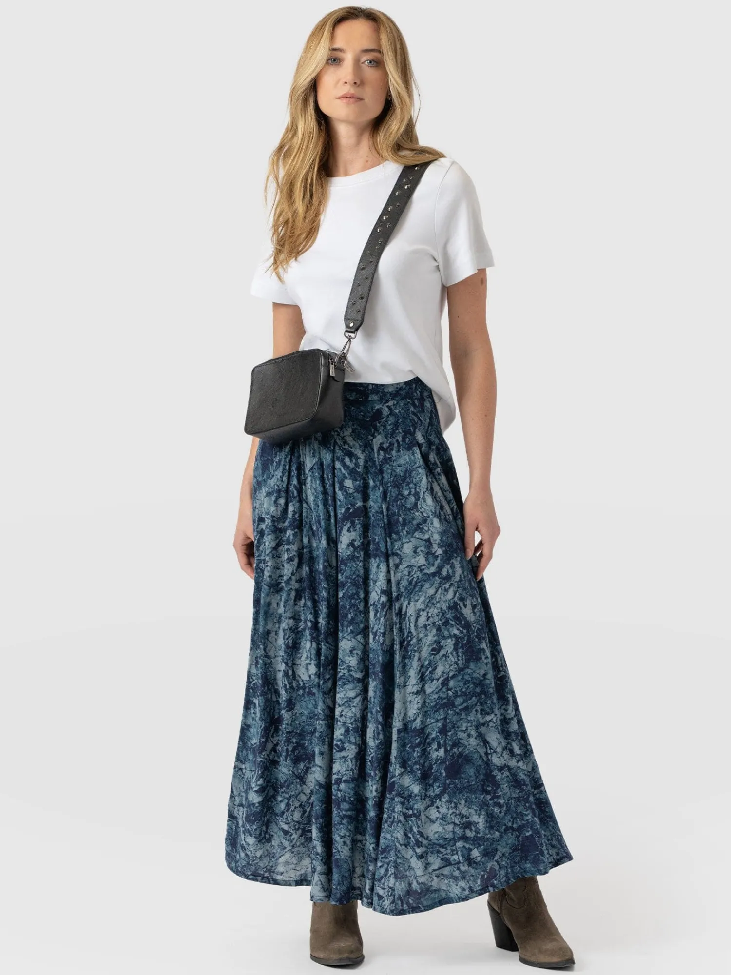 A classic silhouette for everyday wear, our Eliza skirt is made from a marbled cupro material and shaped to a flattering A-line silhouette. This timeless style is designed to sit at your waist with a flat waistband before falling into box pleats, which help to create a breezy finish. Wear yours with a white tee, chunky knitwear for warmth, and a pair of croc-embossed trainers to create a look with edge.