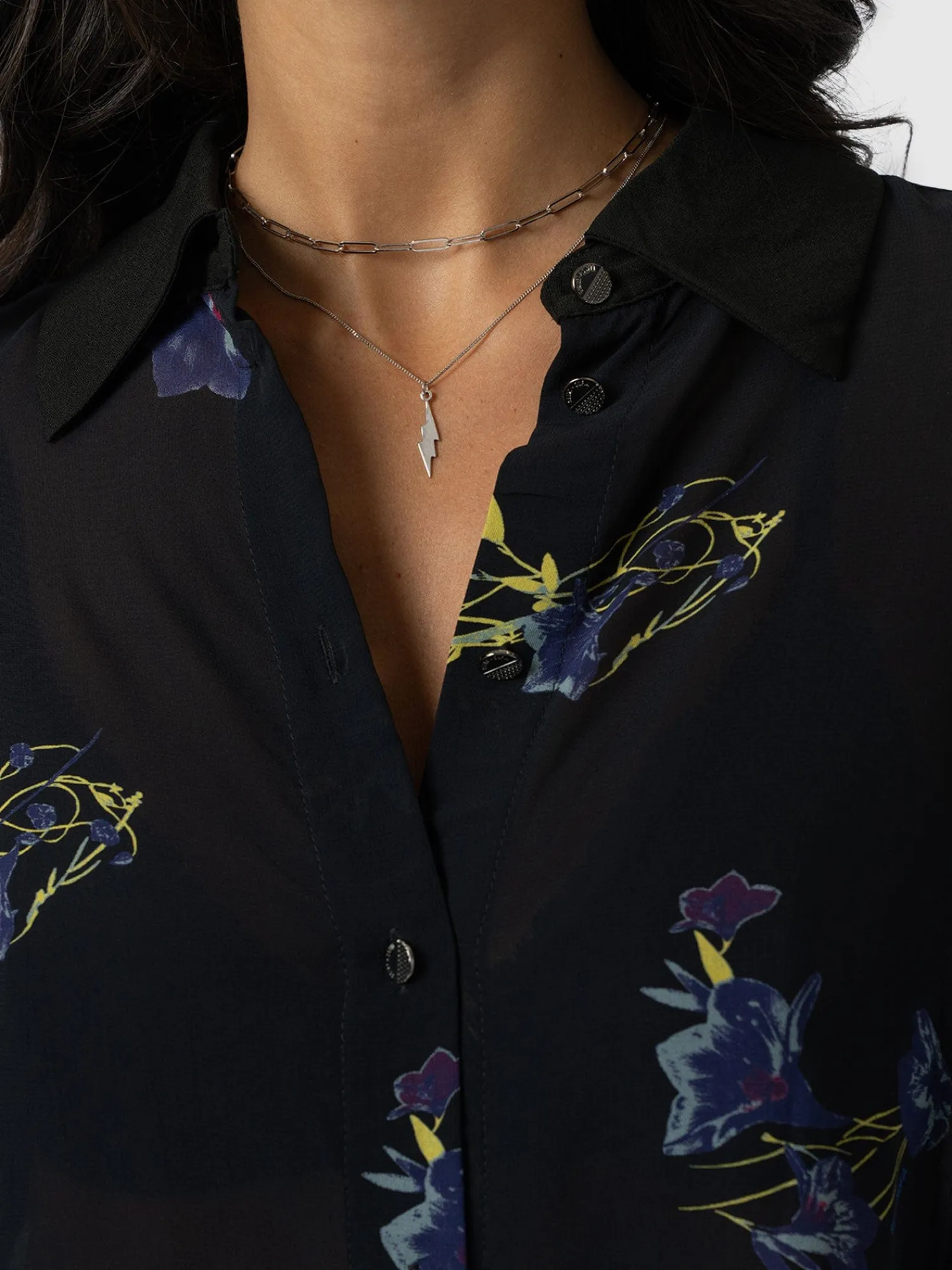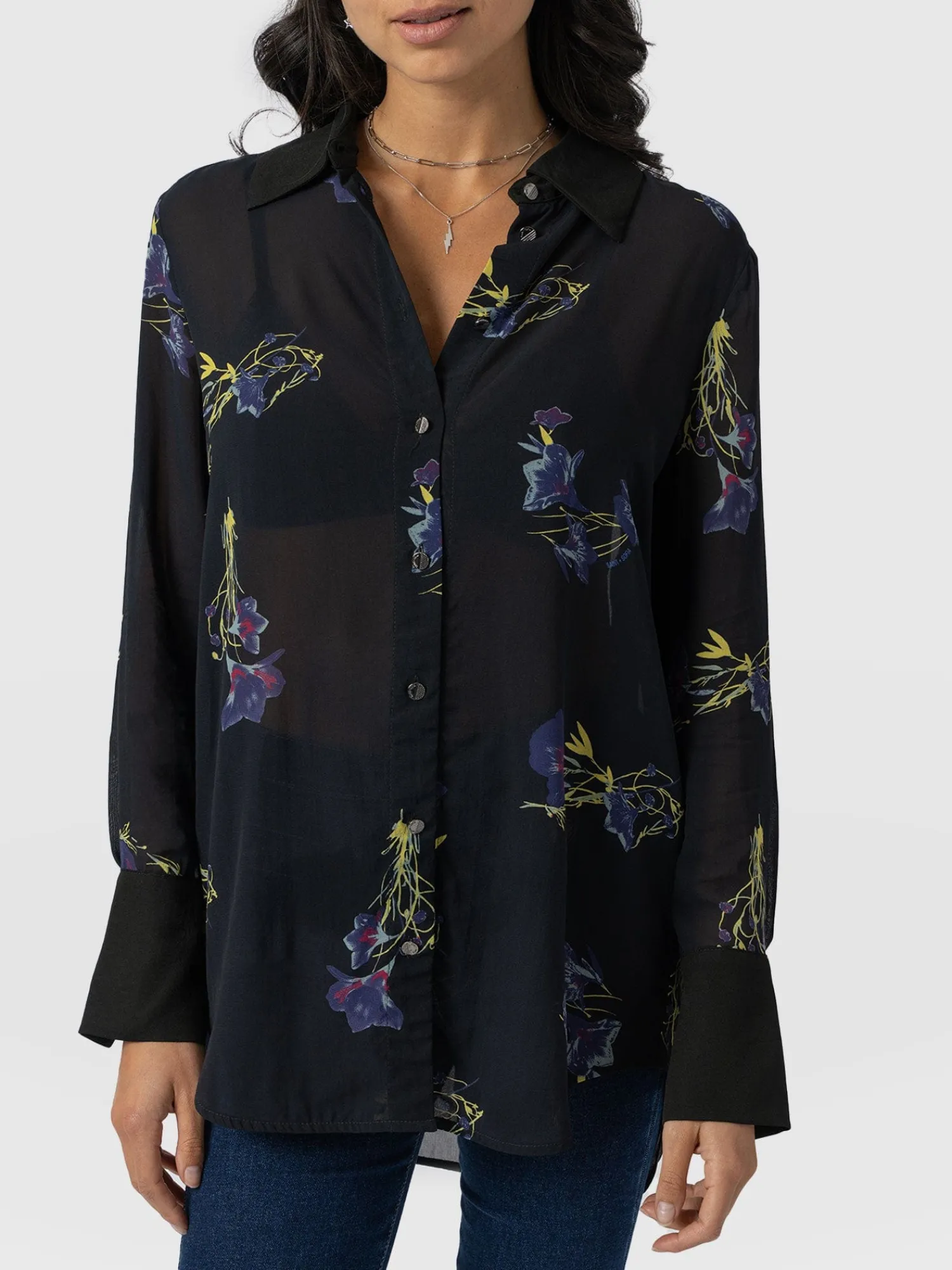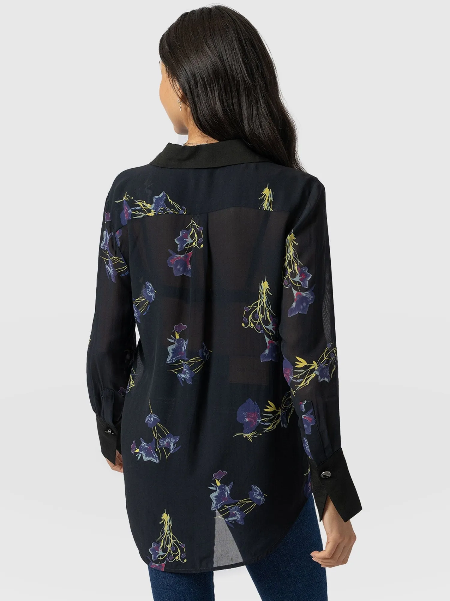 The Madison Shirt in Blue Lily Gardens is a capsule wardrobe must-have for creating timeless and elegant looks ready for any occasion. Individually handmade in Europe, each print is unique using a semi-sheer georgette fabric decorated with a floral print and trimmed with gunmetal buttons. Its relaxed shape is perfect for pairing with our Maeva skinny jeans and finishing with a pair of ankle boots for a chic and sophisticated look.