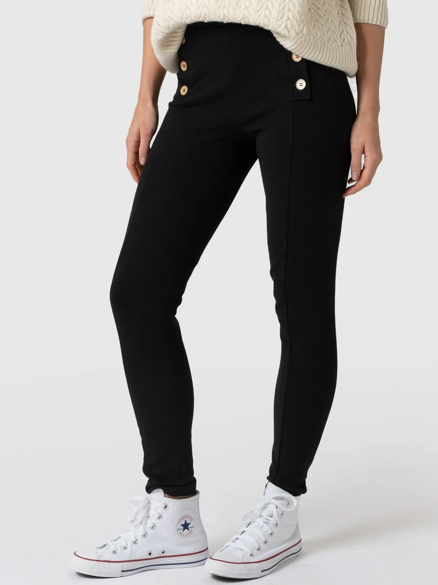 A classic legging in black, made with a soft and sustainable fabric and gold button detail. Mid waisted, comfortable fit and made with a beautifully soft stretch cotton. Designed with a flattering shape and a supportive waist. Wear it for work or weekends and pair it with our Weekend Shirt and heels to go from the office to drinks, or with Sneakers and a sweater for a more relaxed look.