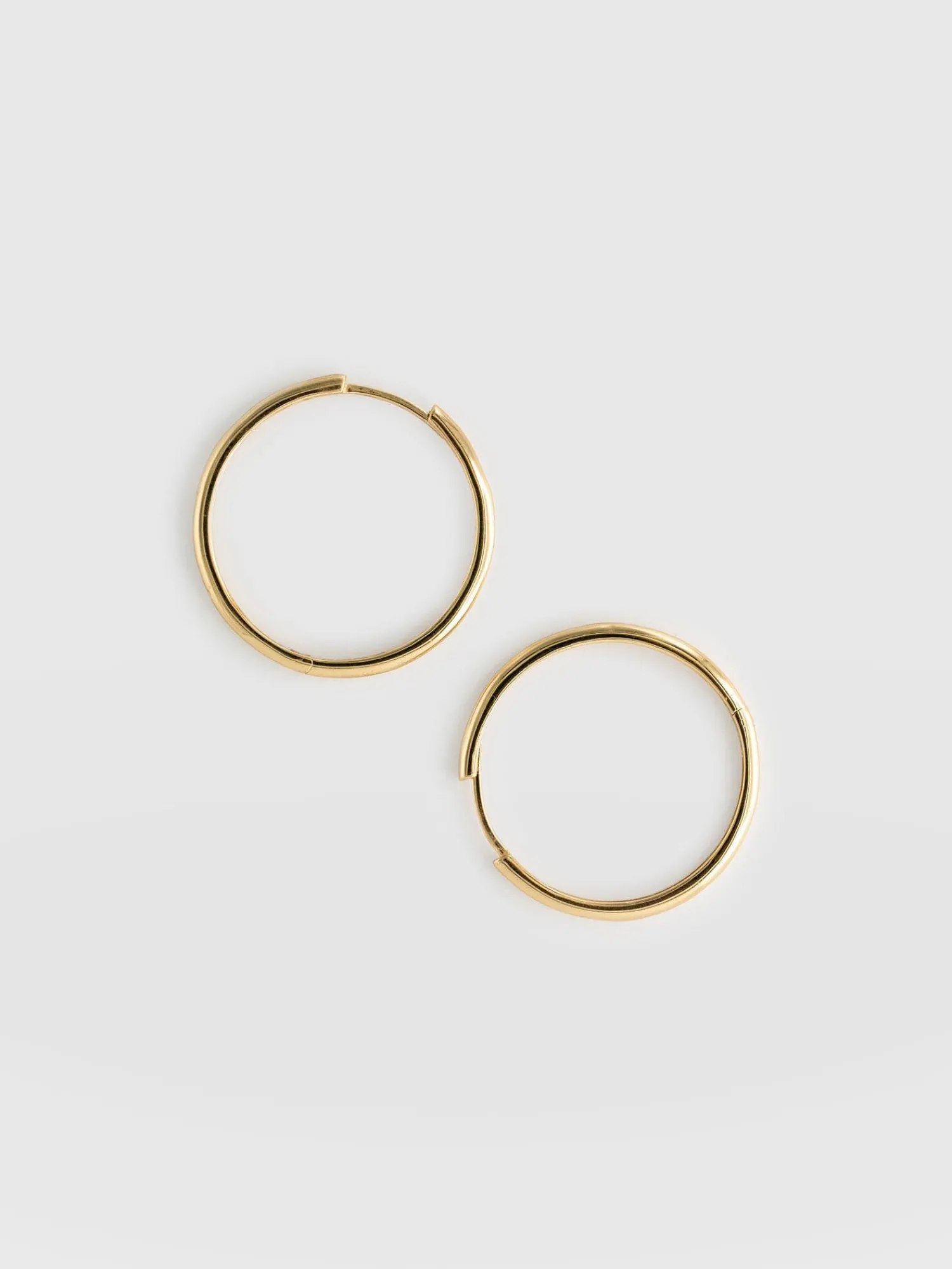 A beautiful, Classic Hoop Earrings in gold that offers timeless appeal. Perfect for styling with any look for work, weekends or as a gift for loved ones. These beautiful 30mm hoop earrings add a touch of refinement to any occasion. Each set is handmade to guarantee precision and a quality that will last for years to come.