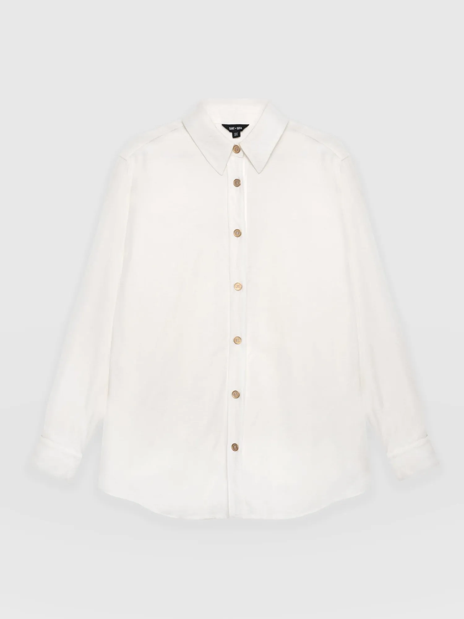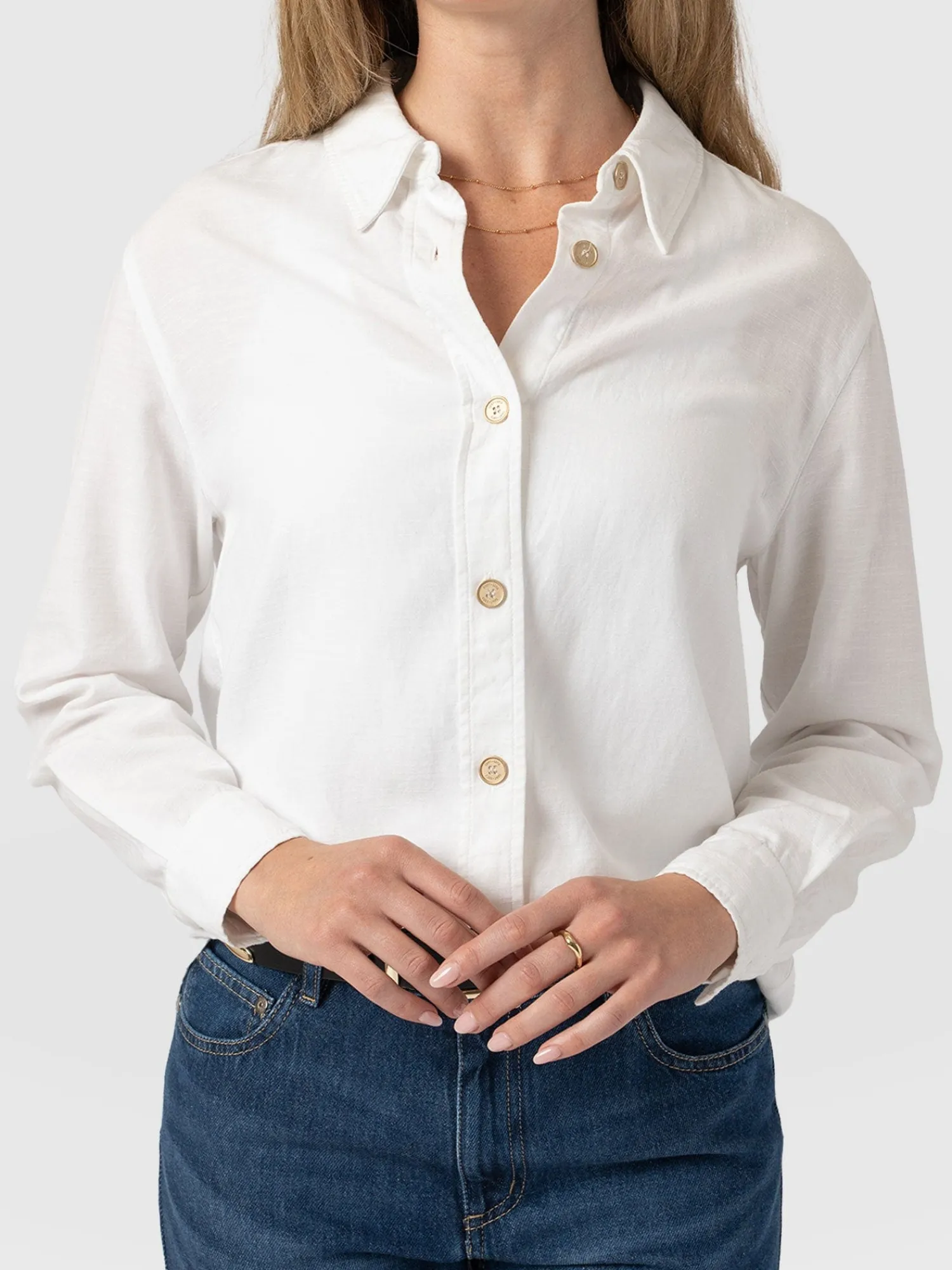 A classic boyfriend shirt in white made with the softest blend of Tencel, cotton and linen. We designed this shirt style with a classic collar neckline and gold button-up detailing. It has a soft and smooth hand-feel and a relaxed, loose fit. Designed in our London studios and handmade in Europe for the perfect fit and feel. Wear open over a cami and jeans or casually with the sleeves rolled up and layered under a knitted vest.