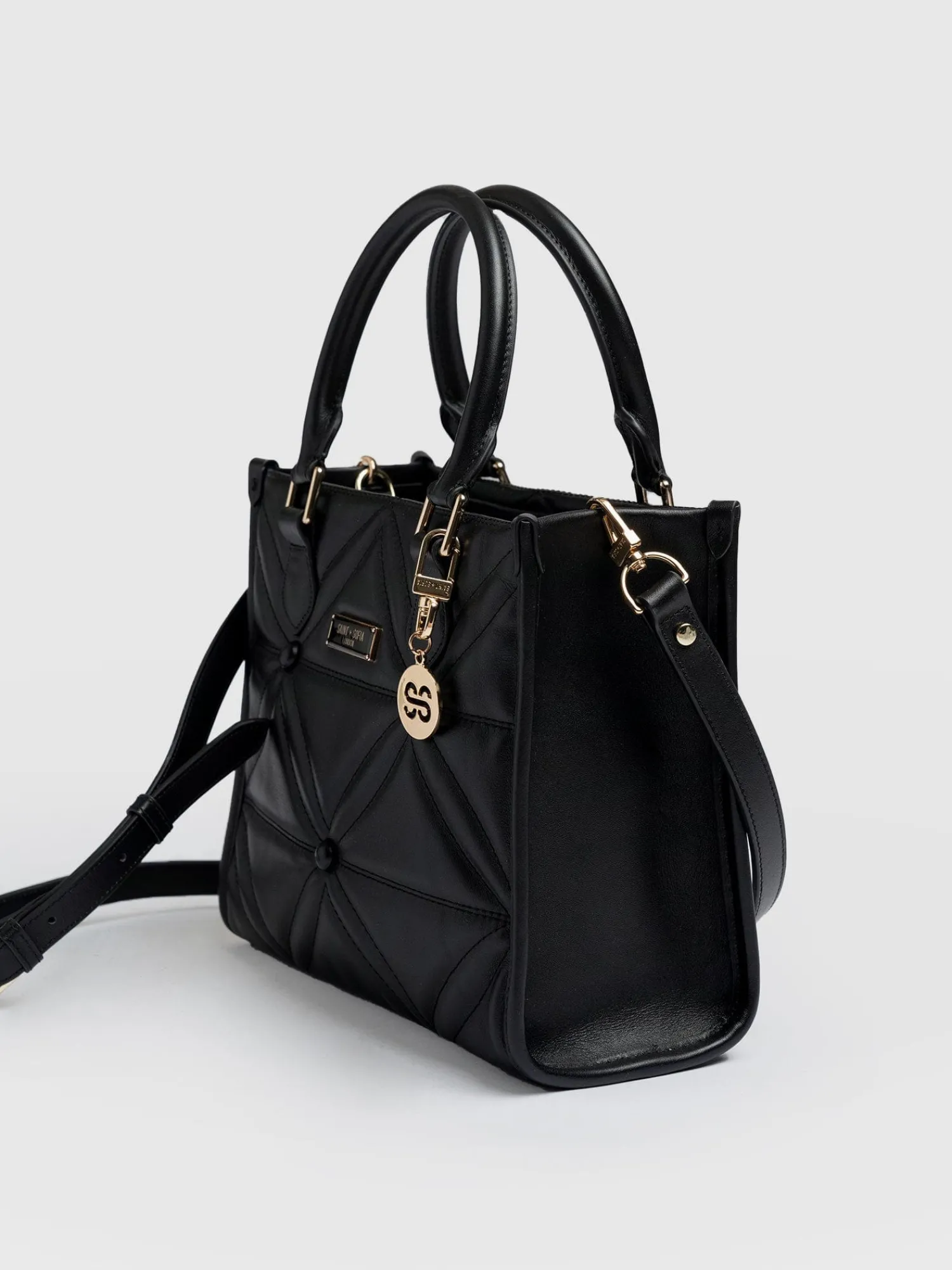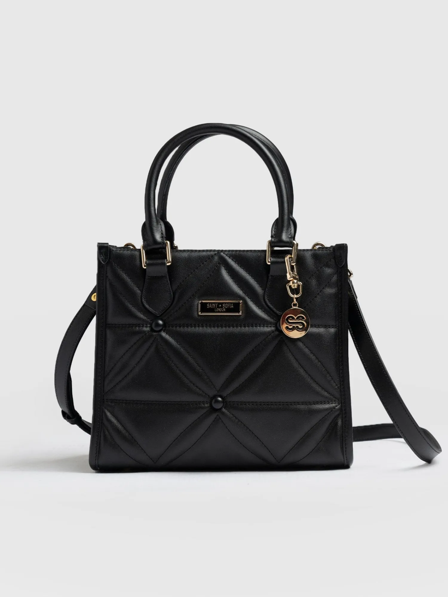 The beautiful, easy-to-use Quilted Mia tote bag in black uses smooth leather to create a structured shape and rolled top-handles. Finished in tonal stitching, it forms a quilted texture perfect for everyday wear. And with a removable shoulder strap, you can switch between crossbody and mini tote when weekend adventures and formal evenings out both feature on the calendar. Signed off with a branded Saint and Sofia plaque at the front, it’s a chic design to add to your collection.