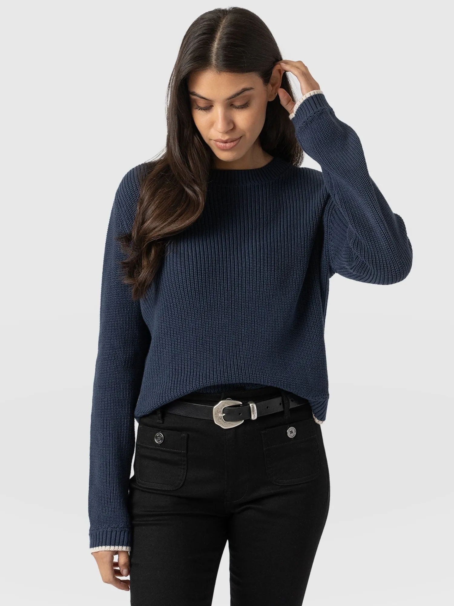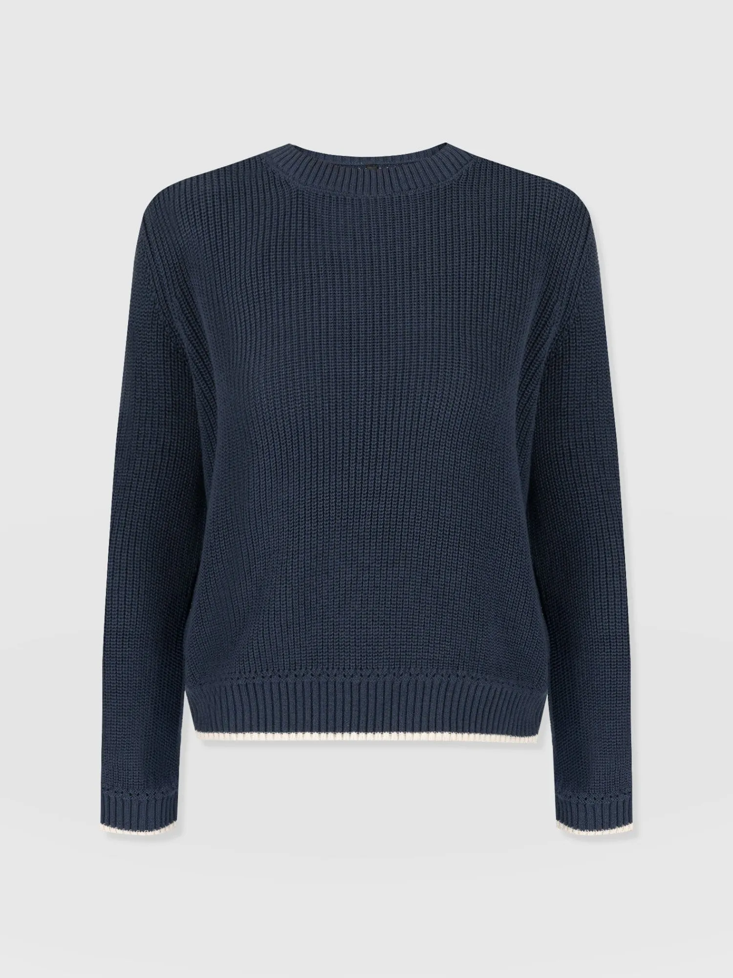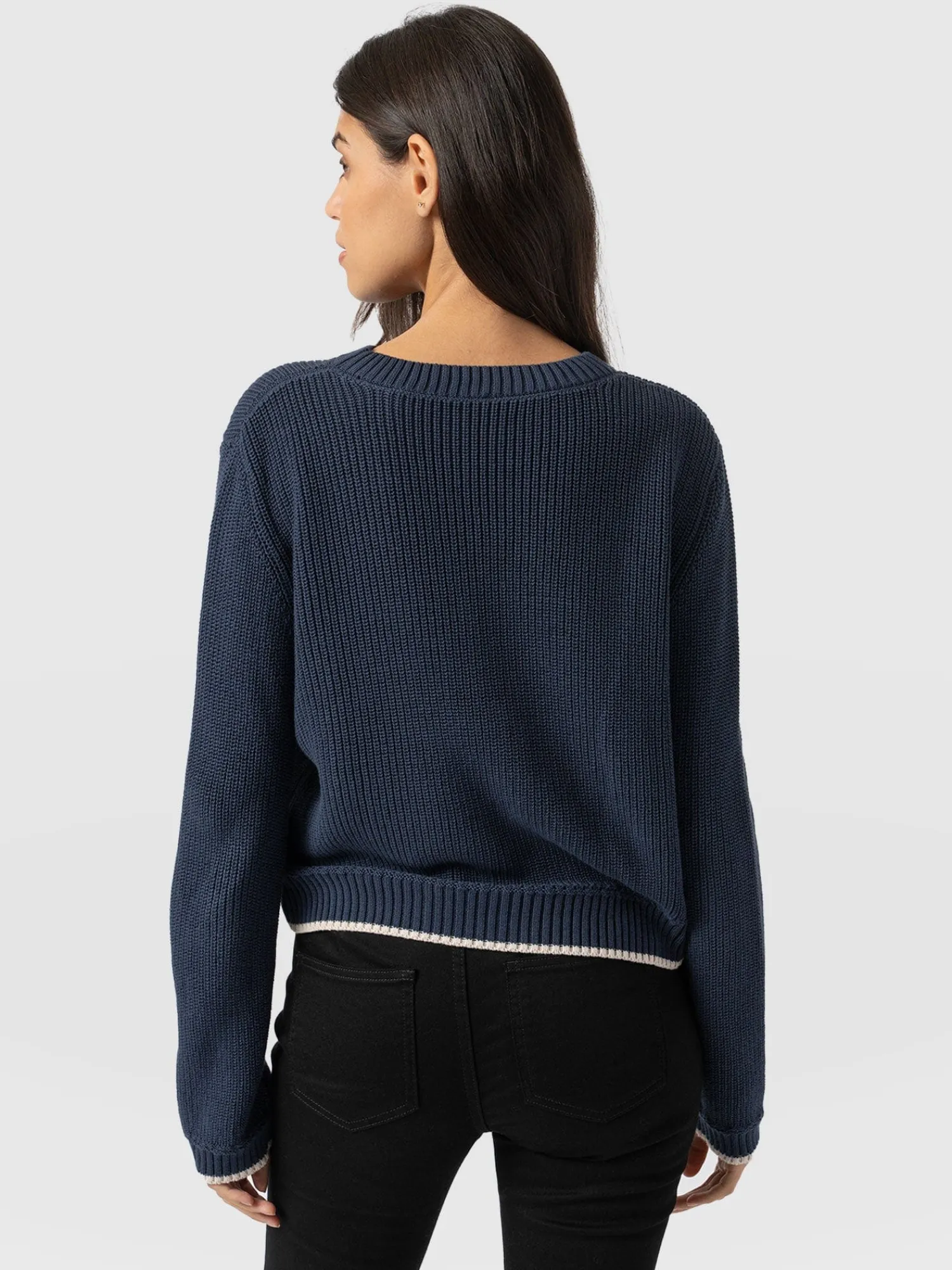 A transitional knit designed for the changing seasons, the Remy Crop Sweater in navy boasts a chunky rib stitch to keep you warm when the weather shifts to cooler temperatures. Its regular-fitting silhouette and crew neckline are handmade using soft and smooth organic cotton and trimmed with contrasting tipping along the cuff and hem for an elegant finish. Dress down with high-waisted jeans and sneakers, or style up with the Bonham Leather Shorts and boots.