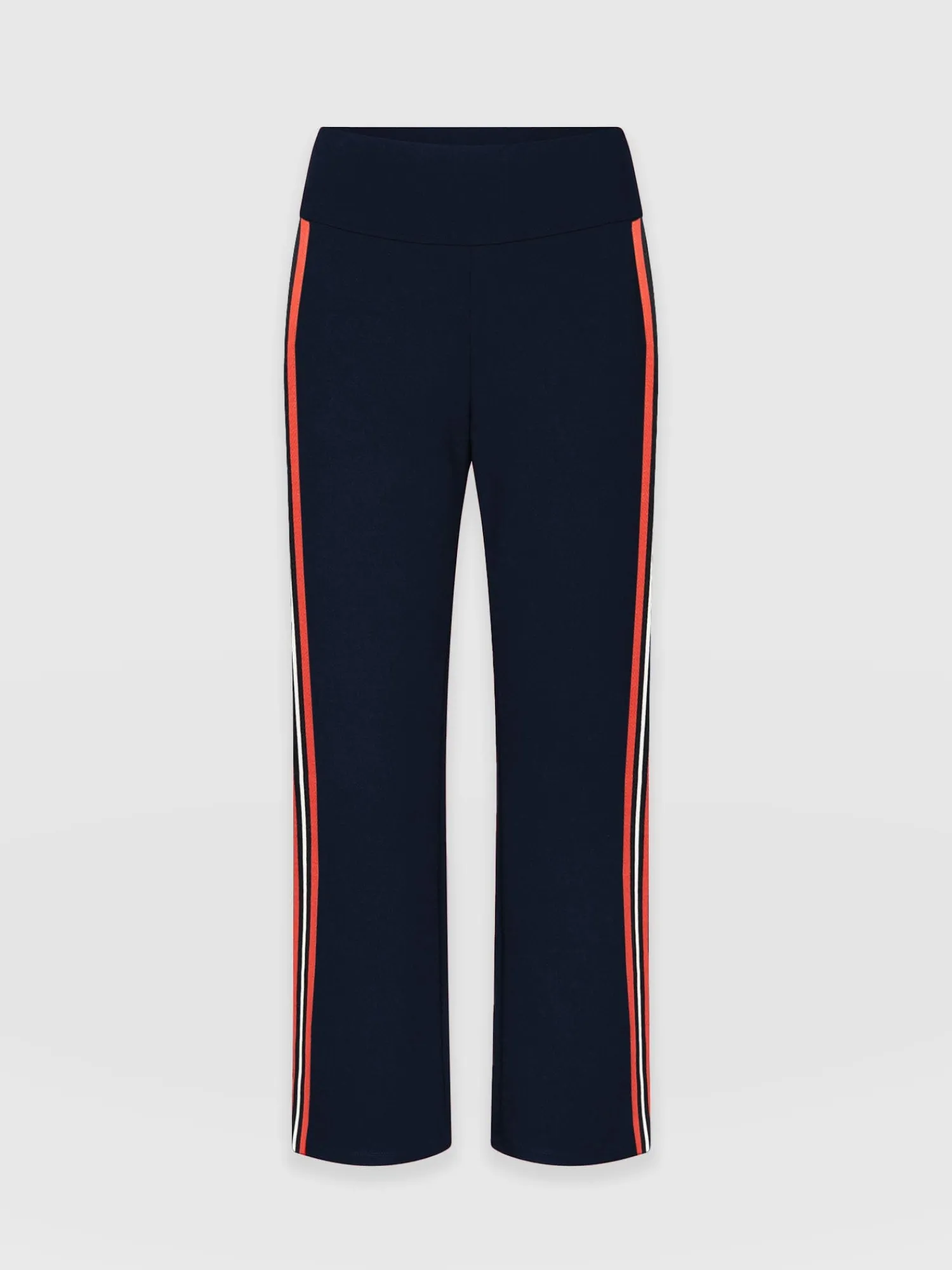 The best selling Runway Pant in navy is a classic straight-leg pant style with a red ribbon detail at the side. High-waisted and always in high demand, they’re infused with elastane for stretch. They’re smarter than jeans but comfortable like leggings. Each pair is made from soft and smooth Ponte Di Roma that has a beautiful drape and boasts a crease-free finish. Perfect for work or weekends, they pair with trainers for a casual look or with heels or boots for evening elegance.