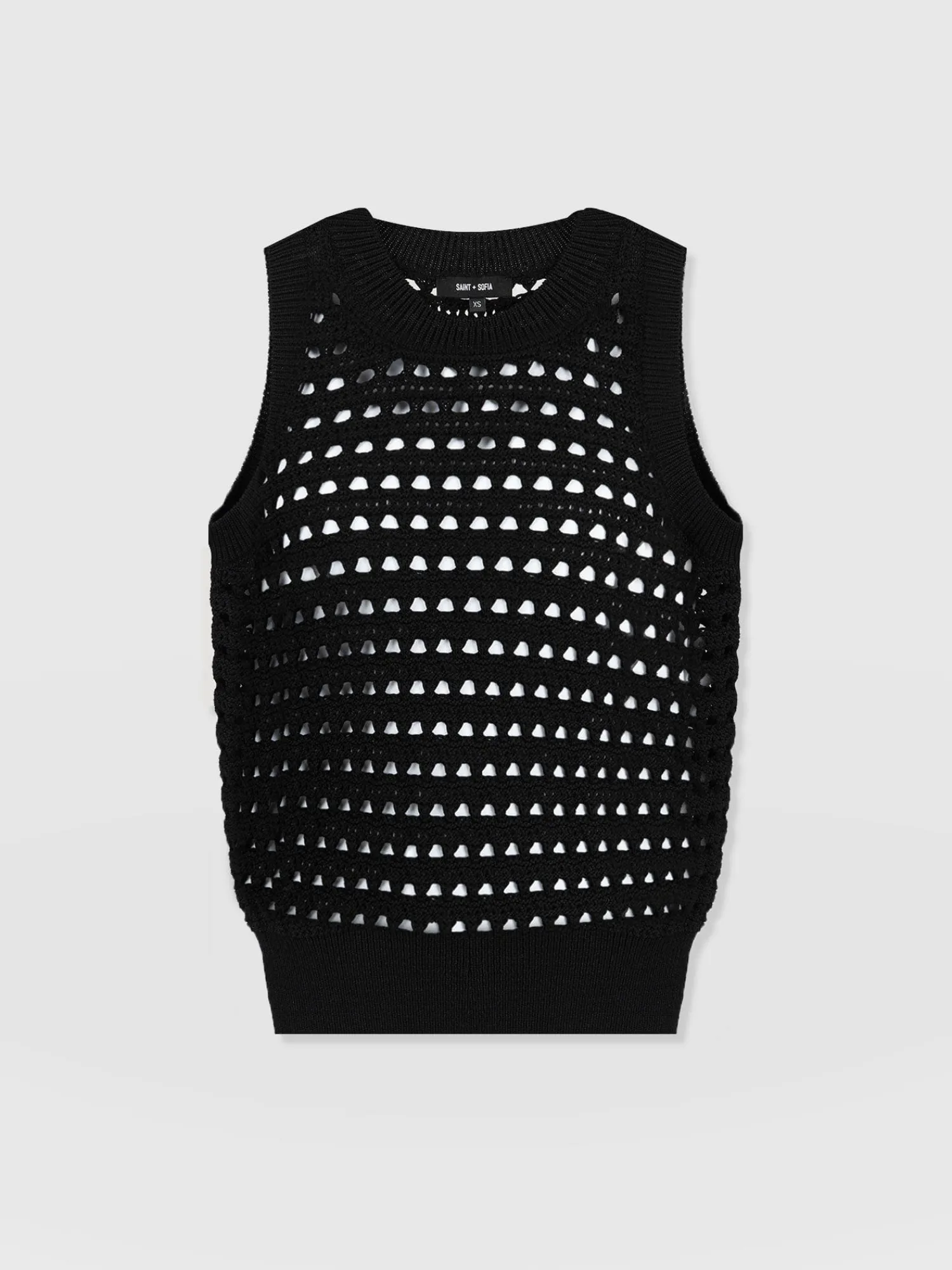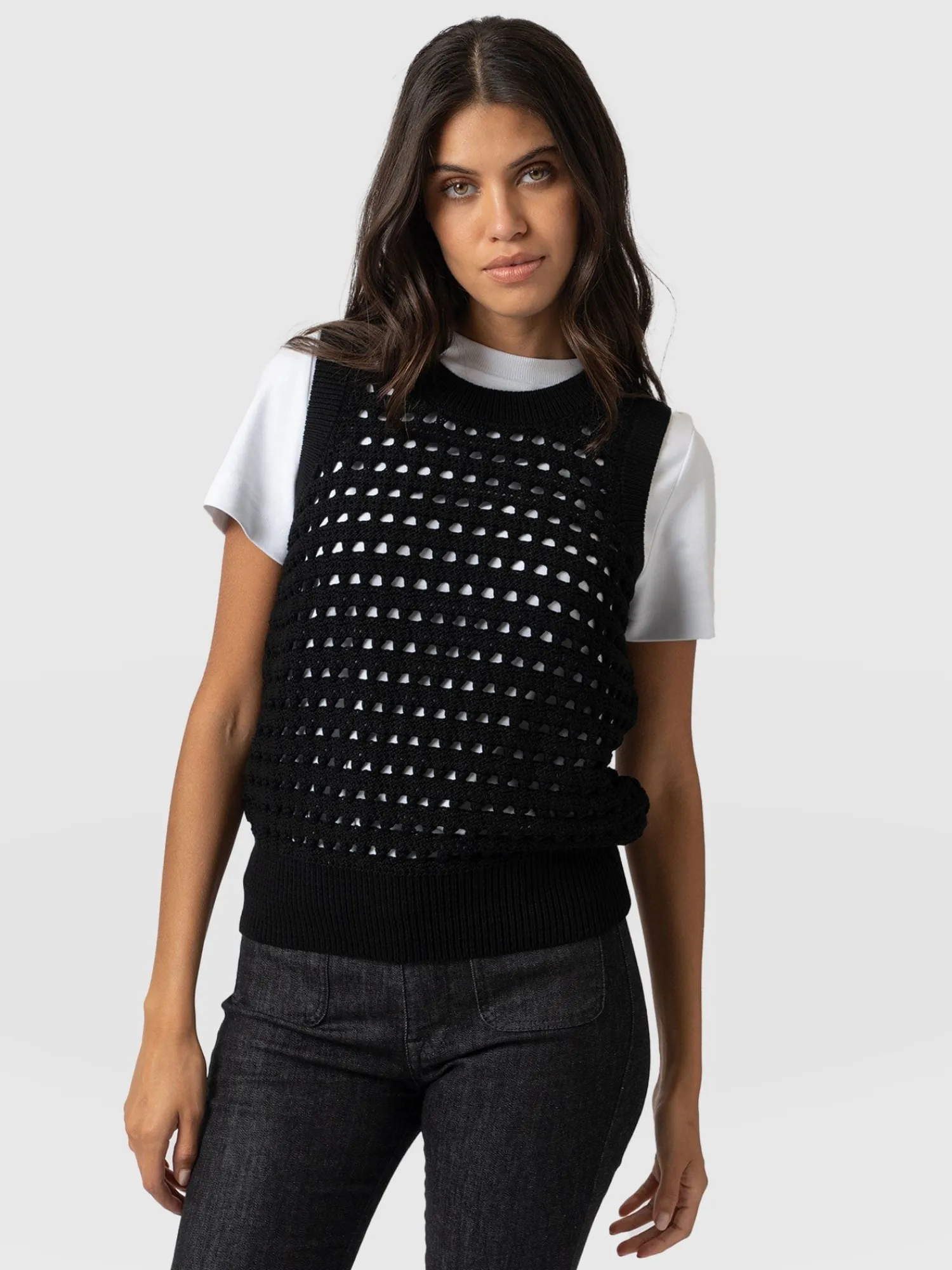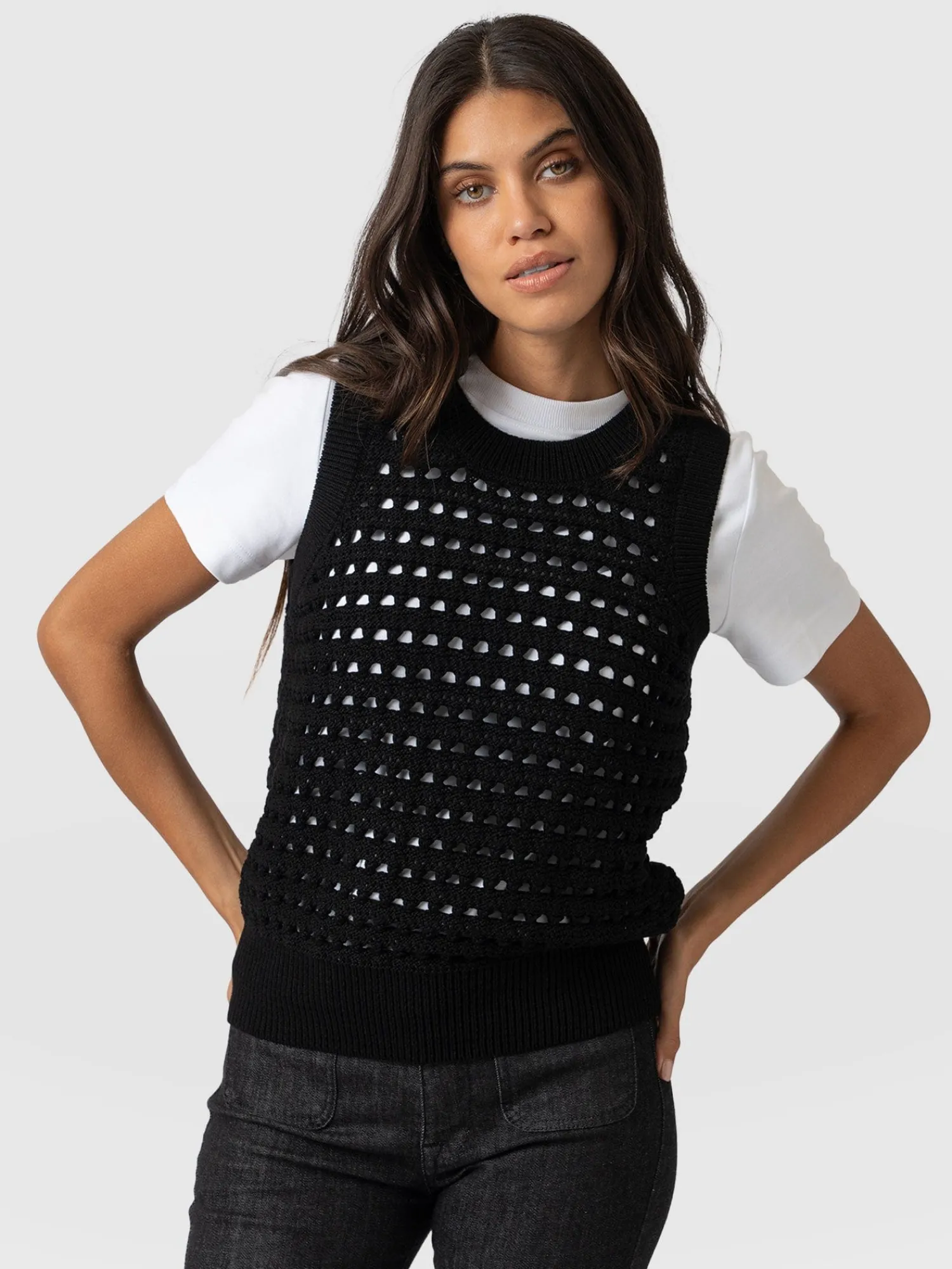 Built for layering, the Adler Sleeveless Knit in black is perfect for those transitional months. It’s woven to an open-k…