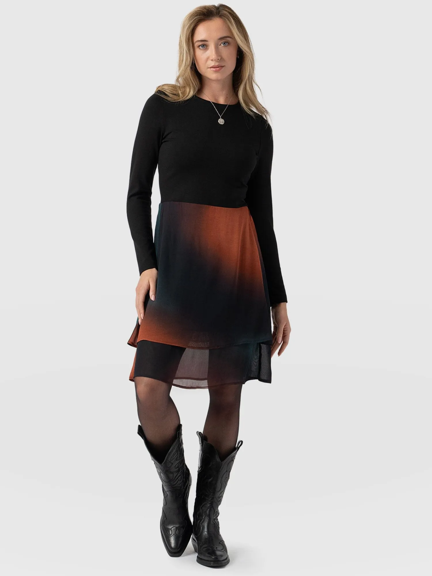 Our best-selling two-tiered skirt is now in a playful mini-dress form. The Etta Mini Layered Dress features our signature layered viscose skirt in a new Orange Coral gradient print. As for the slim-fitting bodice, that’s masterfully made by hand using an interlocking jersey and shaped to a classic crew neckline with long sleeves. Wear yours with black cowboy boots and a studded belt to add definition to your waistline.
