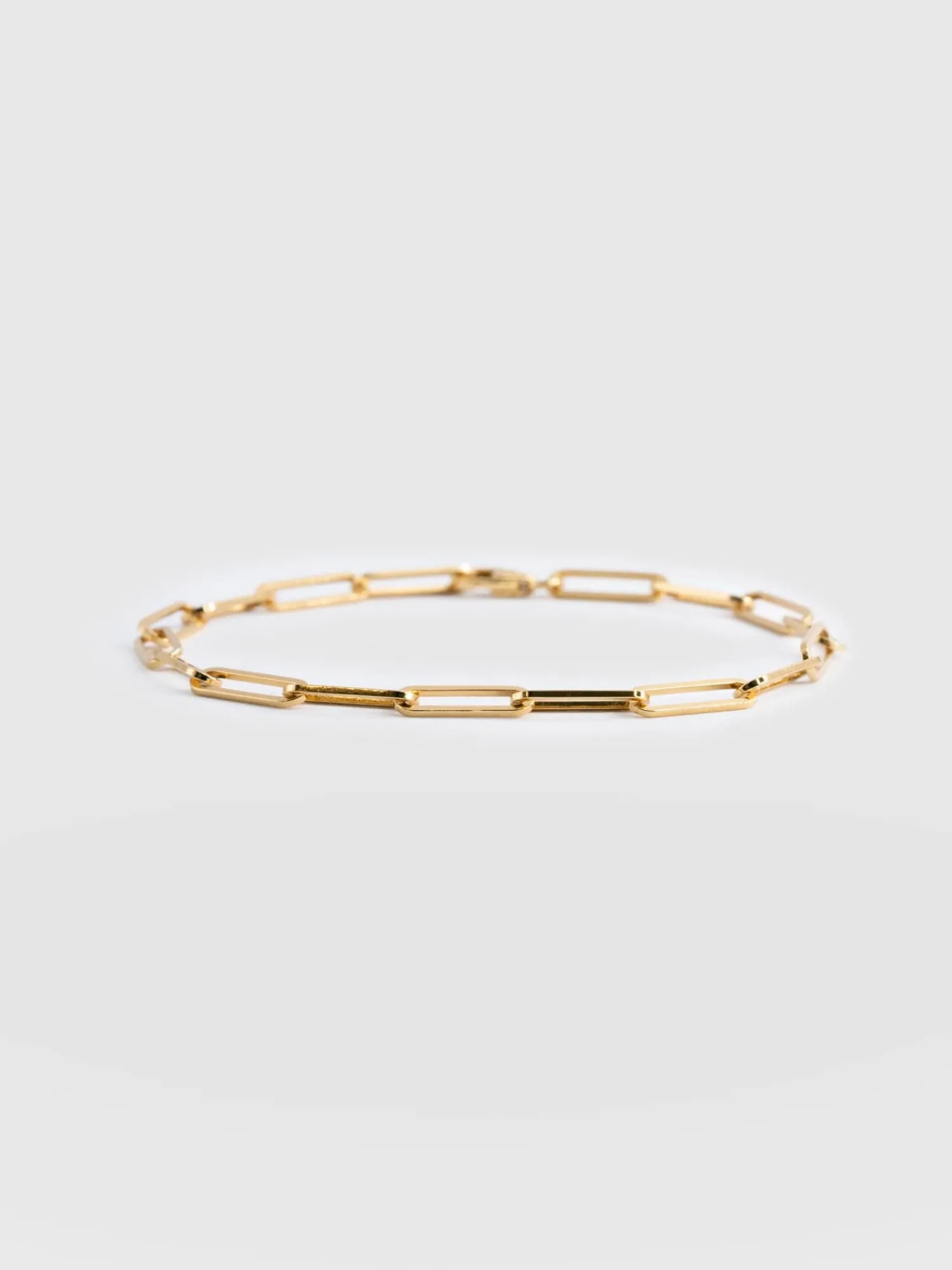 Our Link Chain Bracelet in gold is a beautiful addition to your jewelry collection and can add a touch of glamour to any outfit. Perfect for styling your looks for work, weekends or as a gift for loved ones. Beautifully worn on its own or layered with some of your other favourite pieces. Each bracelet is handmade with the ultimate precision. For a complete and coordinated look, pair this bracelet with our matching necklace and earrings.