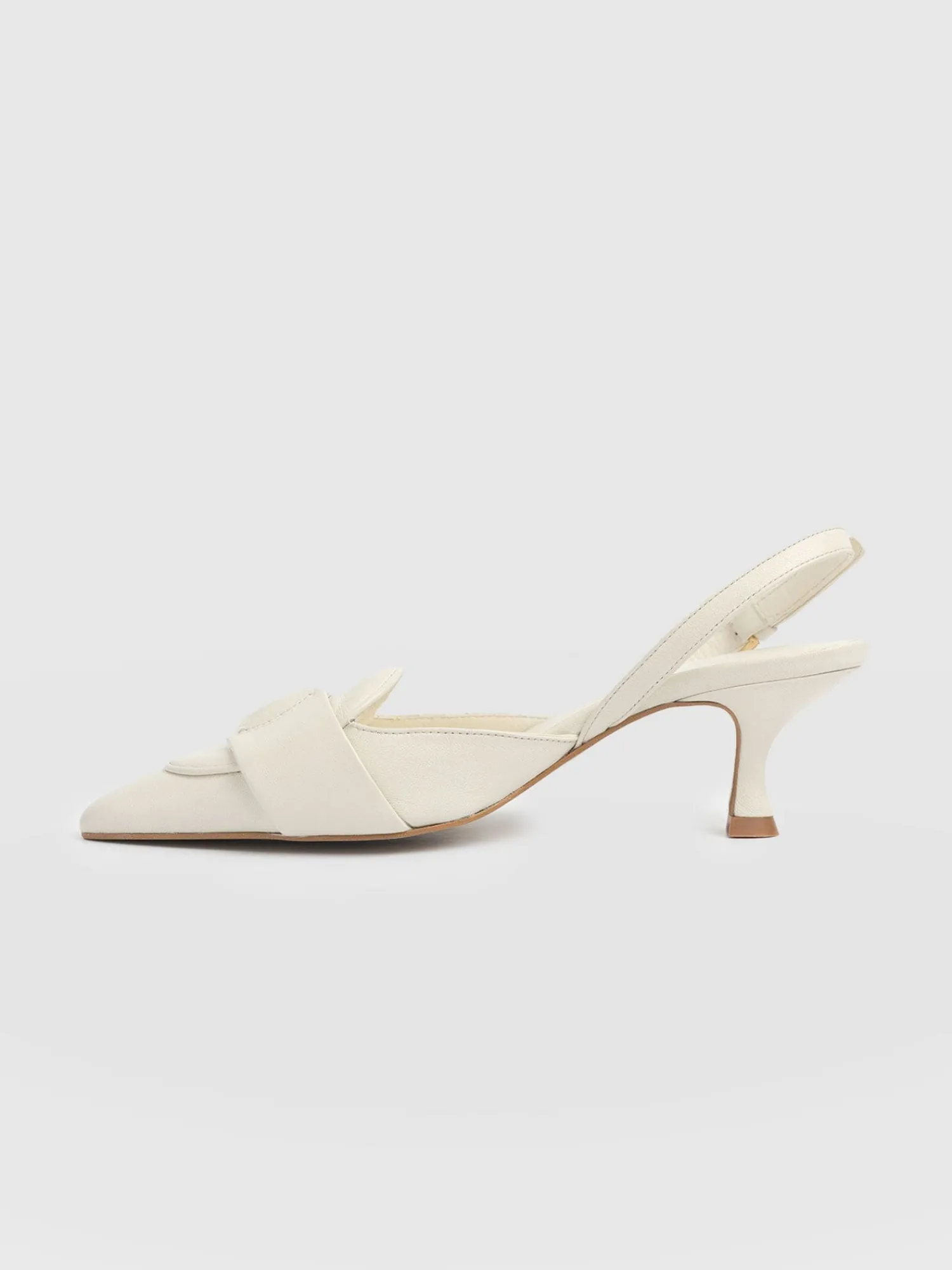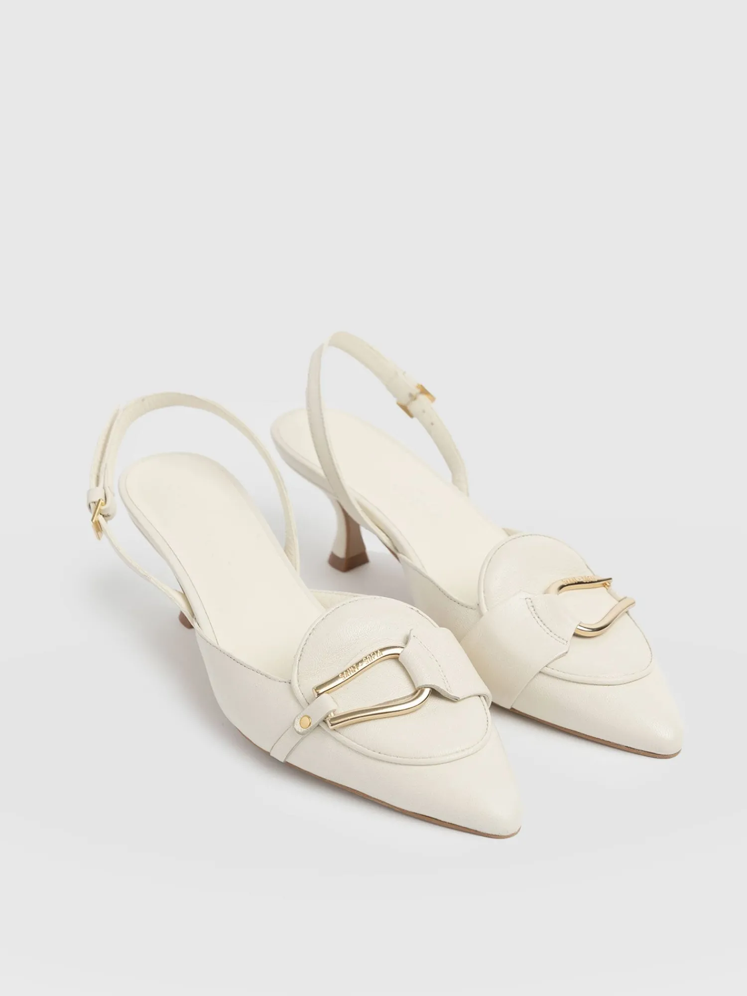 Beautifully elegant sling-back heels, the Bridget Heels in cream are timeless classics to add to your shoe collection. They’re handmade from real leather and carefully moulded to a pointed toe that’s decorated with a gold buckle detail. At the back, an adjustable strap provides all-day comfort, while a chic kitten heel helps to elevate your look. Wear yours with skirts, dresses, or a pair of tailored wide-leg pants.