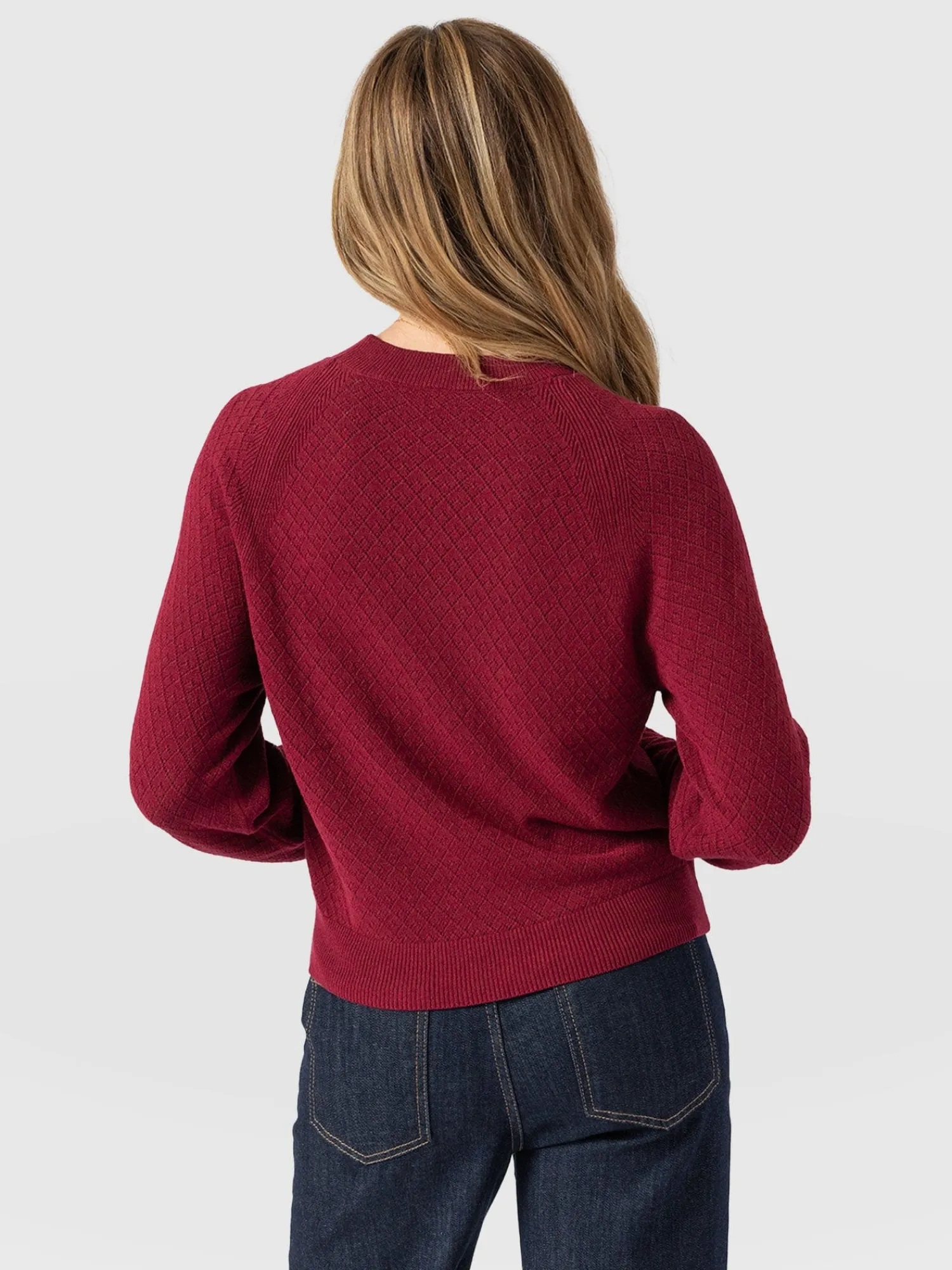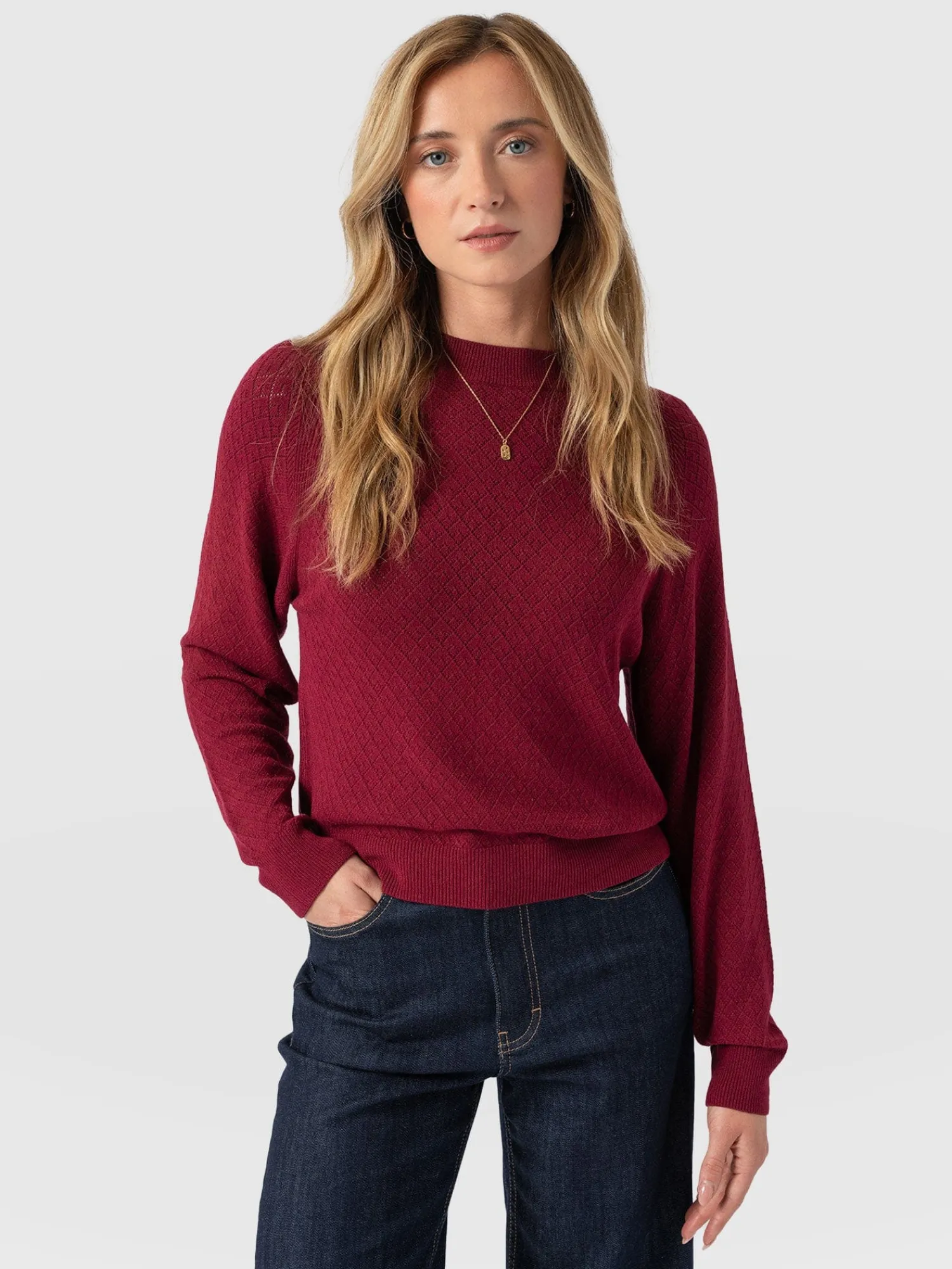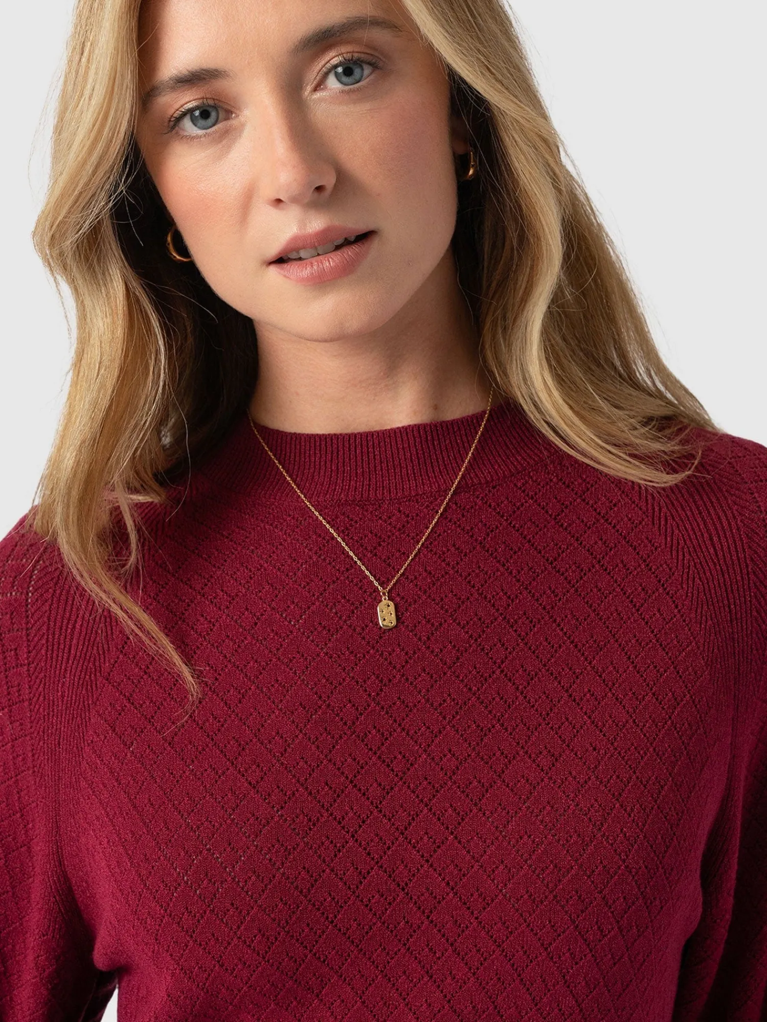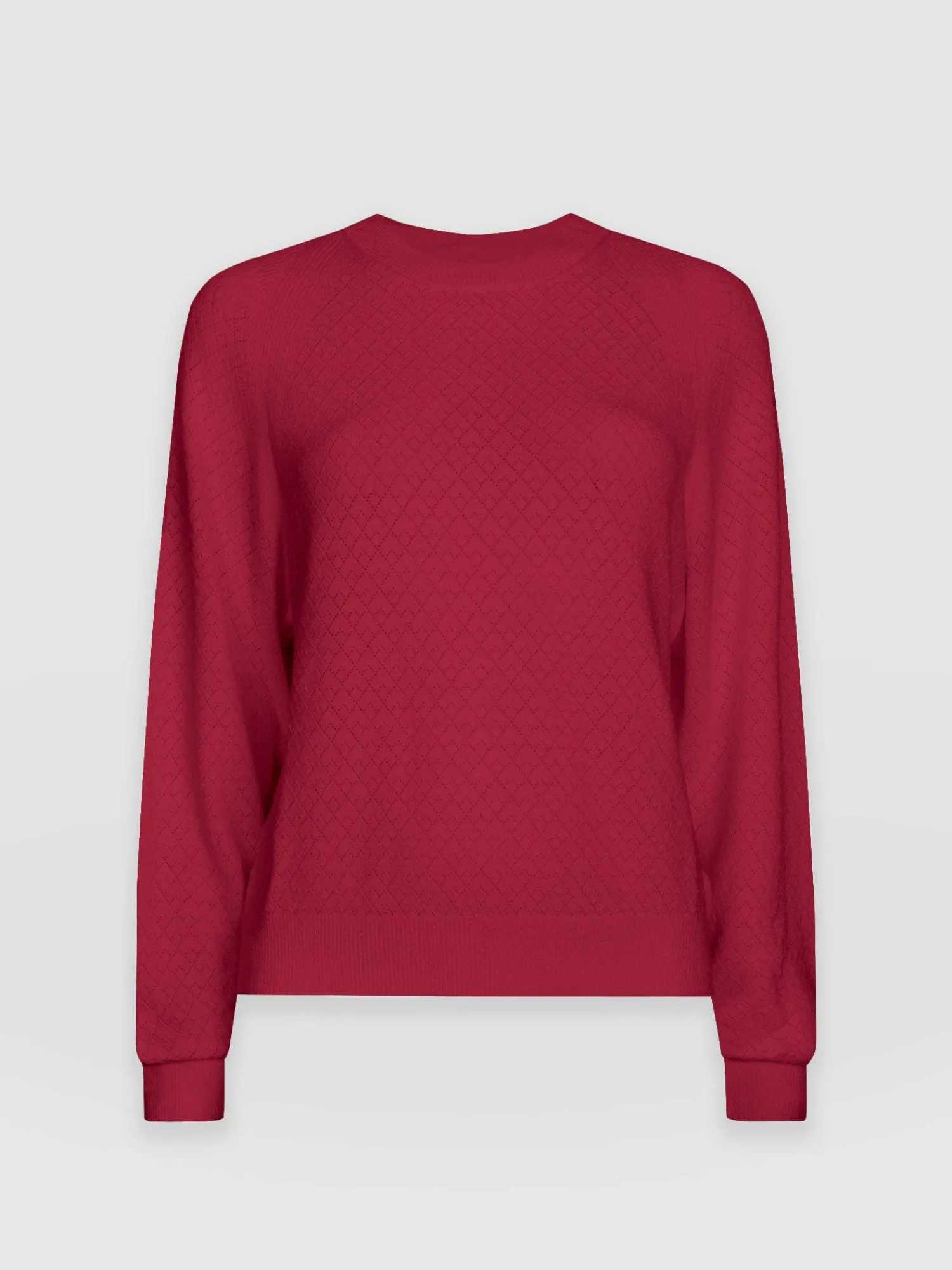 A beautiful, lightweight knitted sweater in Deep Pink with a diamond lace hole detail across its entire frame. We design…