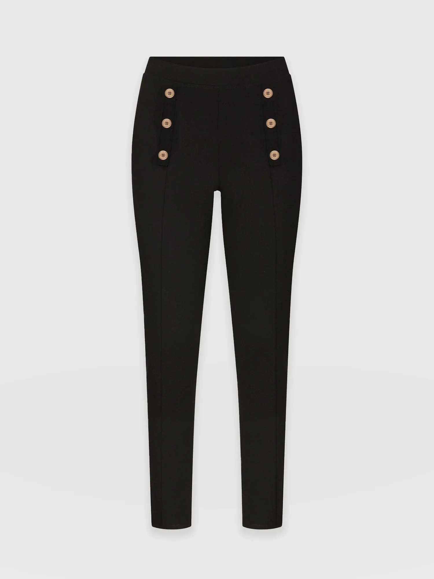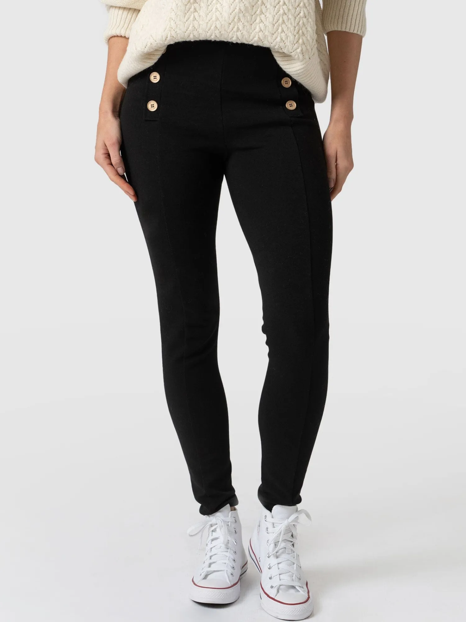 A classic legging in black, made with a soft and sustainable fabric and gold button detail. Mid waisted, comfortable fit and made with a beautifully soft stretch cotton. Designed with a flattering shape and a supportive waist. Wear it for work or weekends and pair it with our Weekend Shirt and heels to go from the office to drinks, or with Sneakers and a sweater for a more relaxed look.