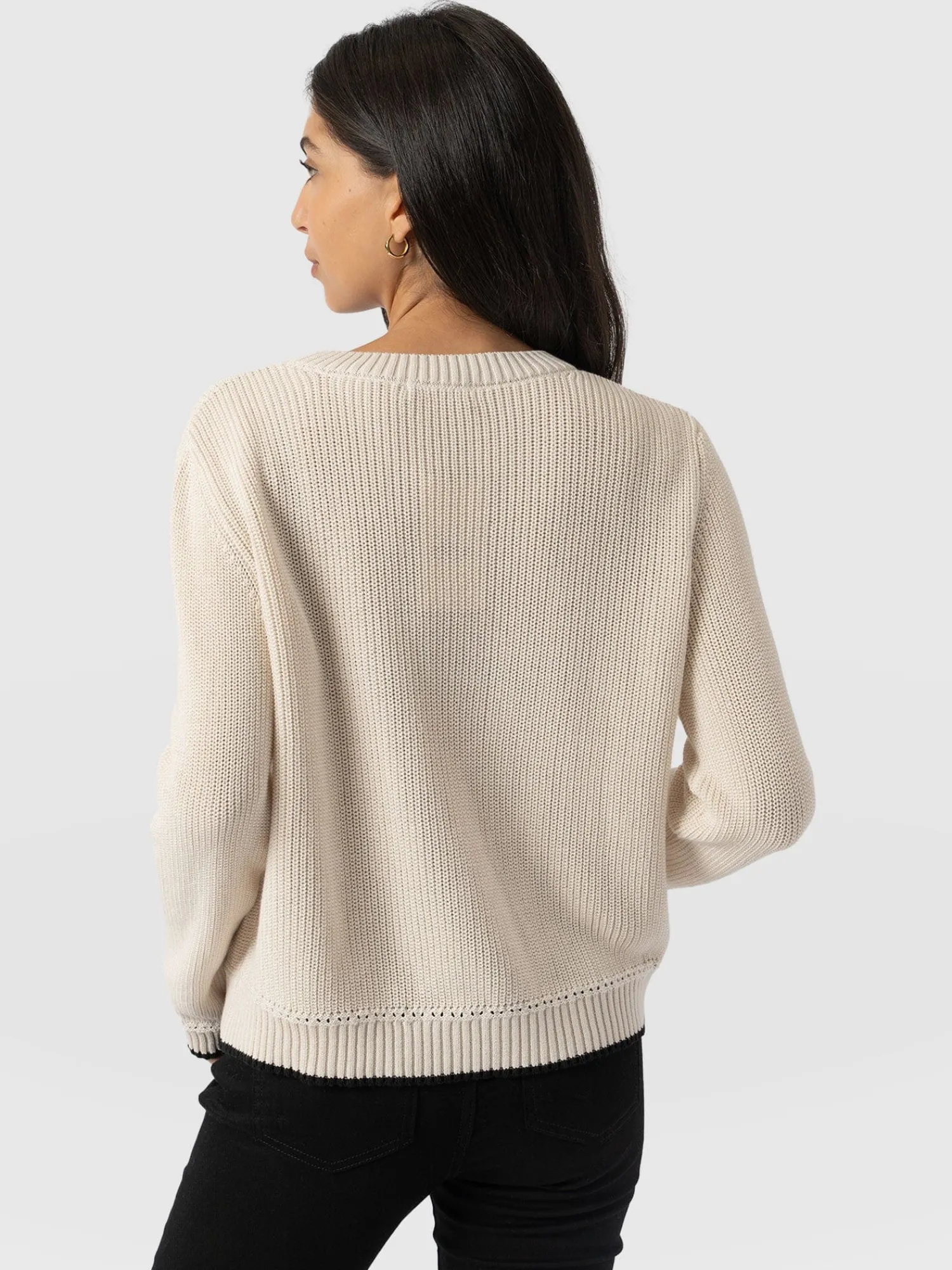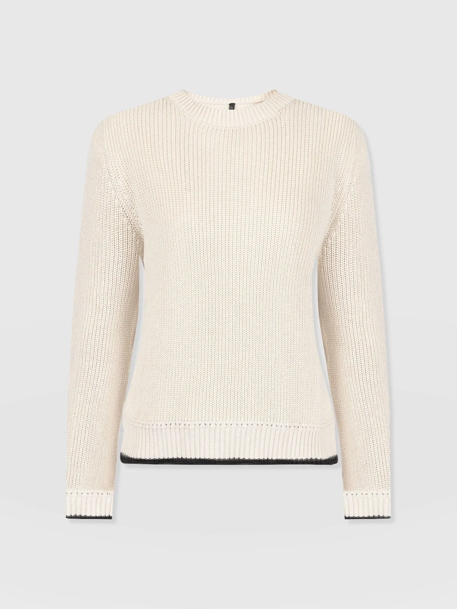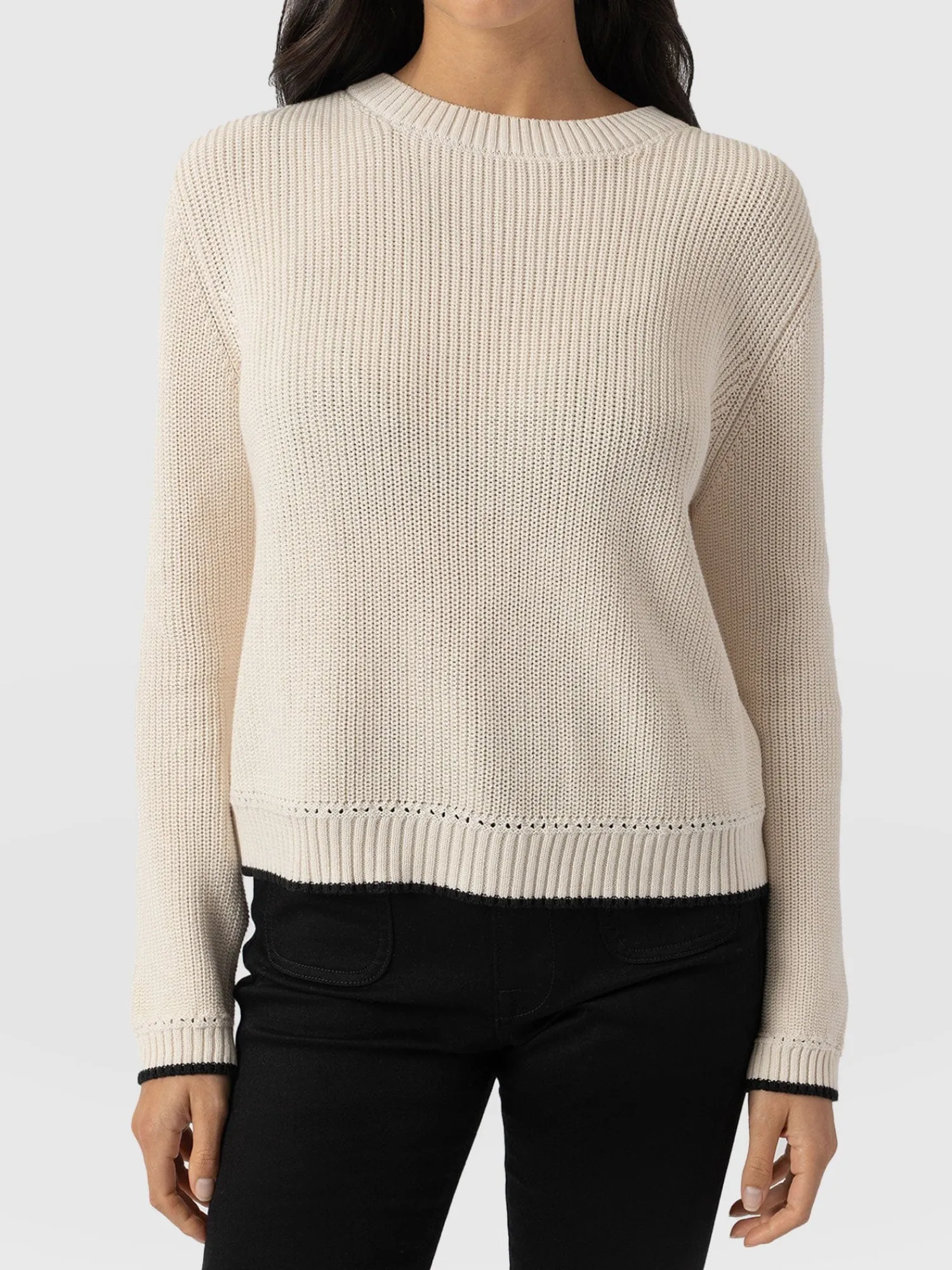 A transitional knit designed for the changing seasons, the Remy Crop Sweater in cream boasts a chunky rib stitch to keep you warm when the weather shifts to cooler temperatures. Its regular-fitting silhouette and crew neckline are handmade using soft and smooth organic cotton and trimmed with contrasting tipping along the cuff and hem for an elegant finish. Dress down with high-waisted jeans and sneakers, or style up with the Bonham Leather Shorts and boots.
