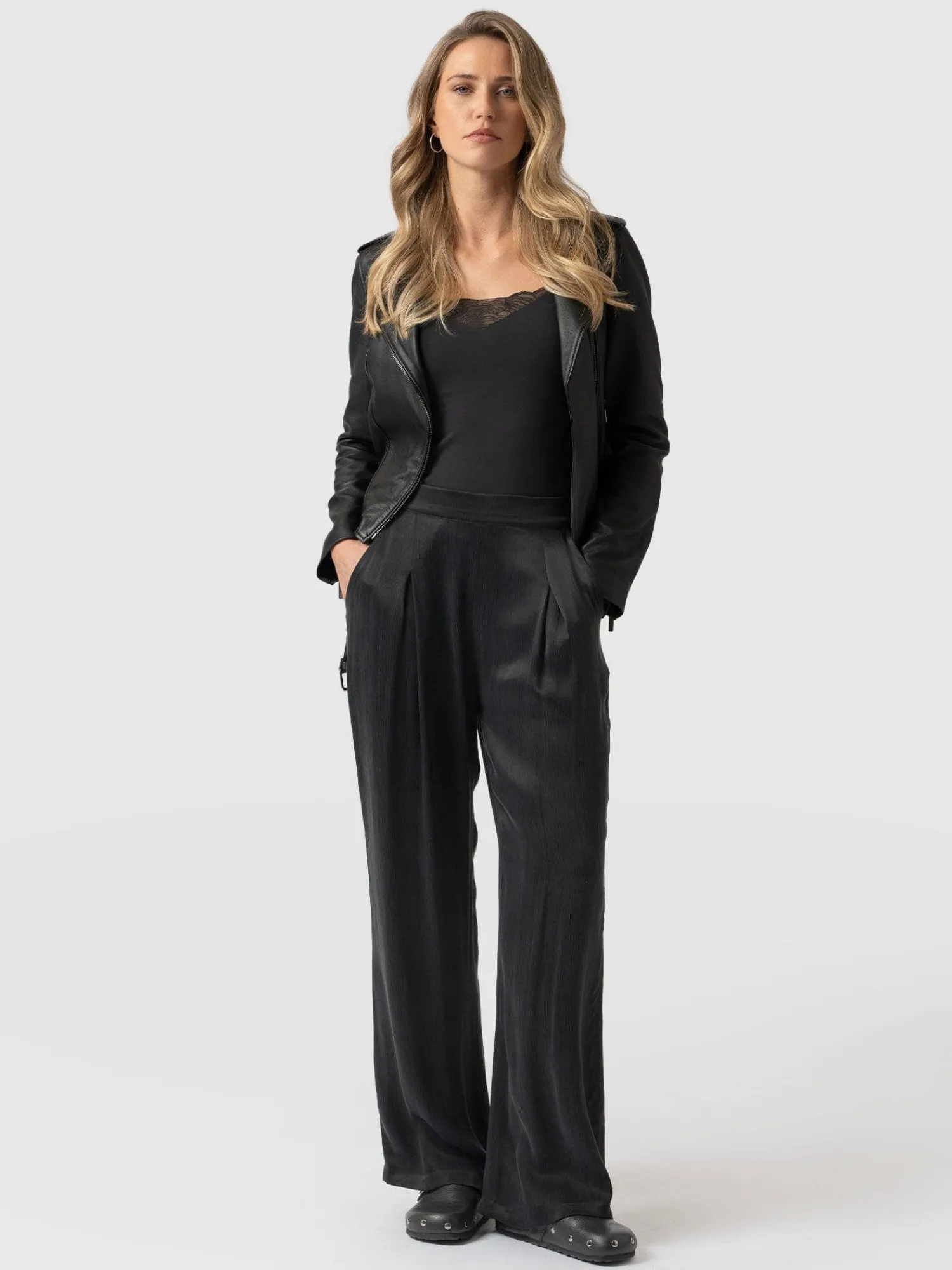 Our timeless Rowan Wide Leg Pant will have you stepping out in style. They’re handmade in our luxurious bettina fabric and trimmed with pockets to keep all your prized possessions safe. Then, they’re topped with an elasticated back waist for day-to-day comfort, and pinned by a front seam and box pleat for an elegant appearance. For maximum impact, wear them with our matching Lace Cami and heeled sandals to complete the look.
