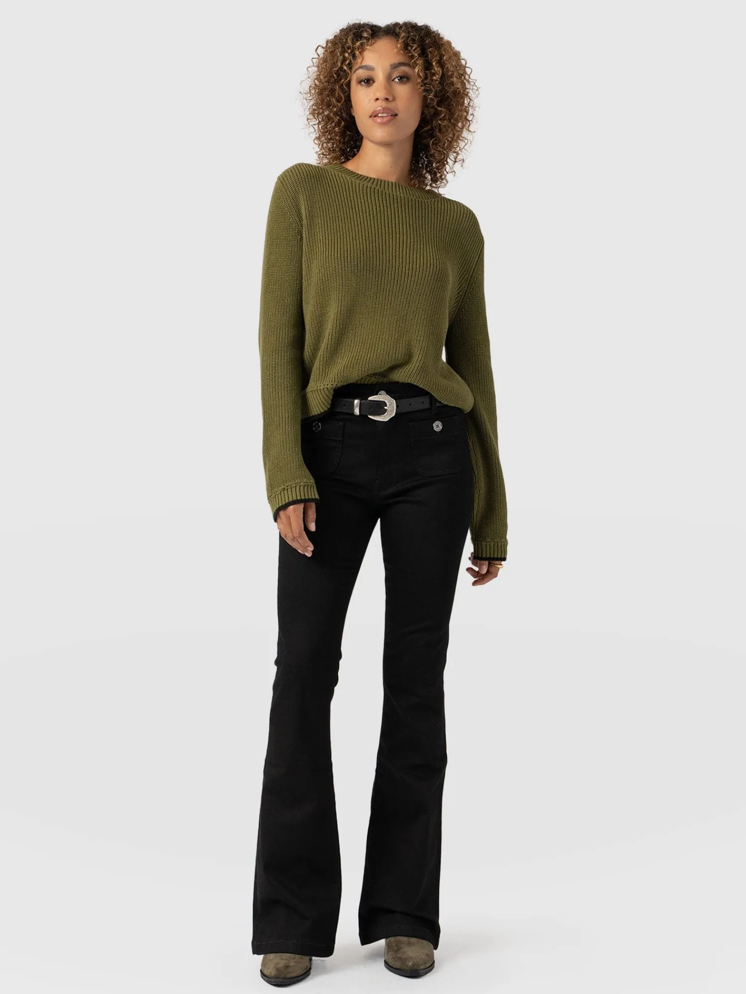 A classic flared jean in jet black with some stretch for a stylish, vintage look. Perfect for work or weekends, these flared jeans have a flattering fit with a high waist and patch pocket detail. Each style is designed in our London studios and hand made in Europe. Wear back with our Riviera Tee, Cambridge Blazer and heels for a night out look.