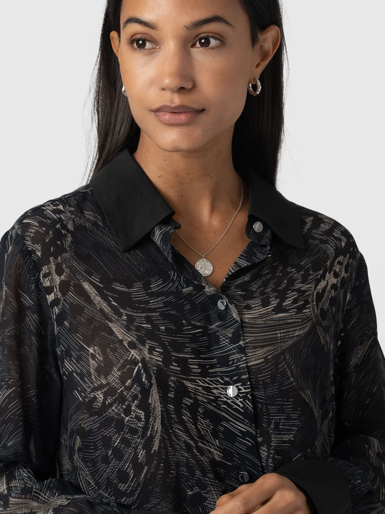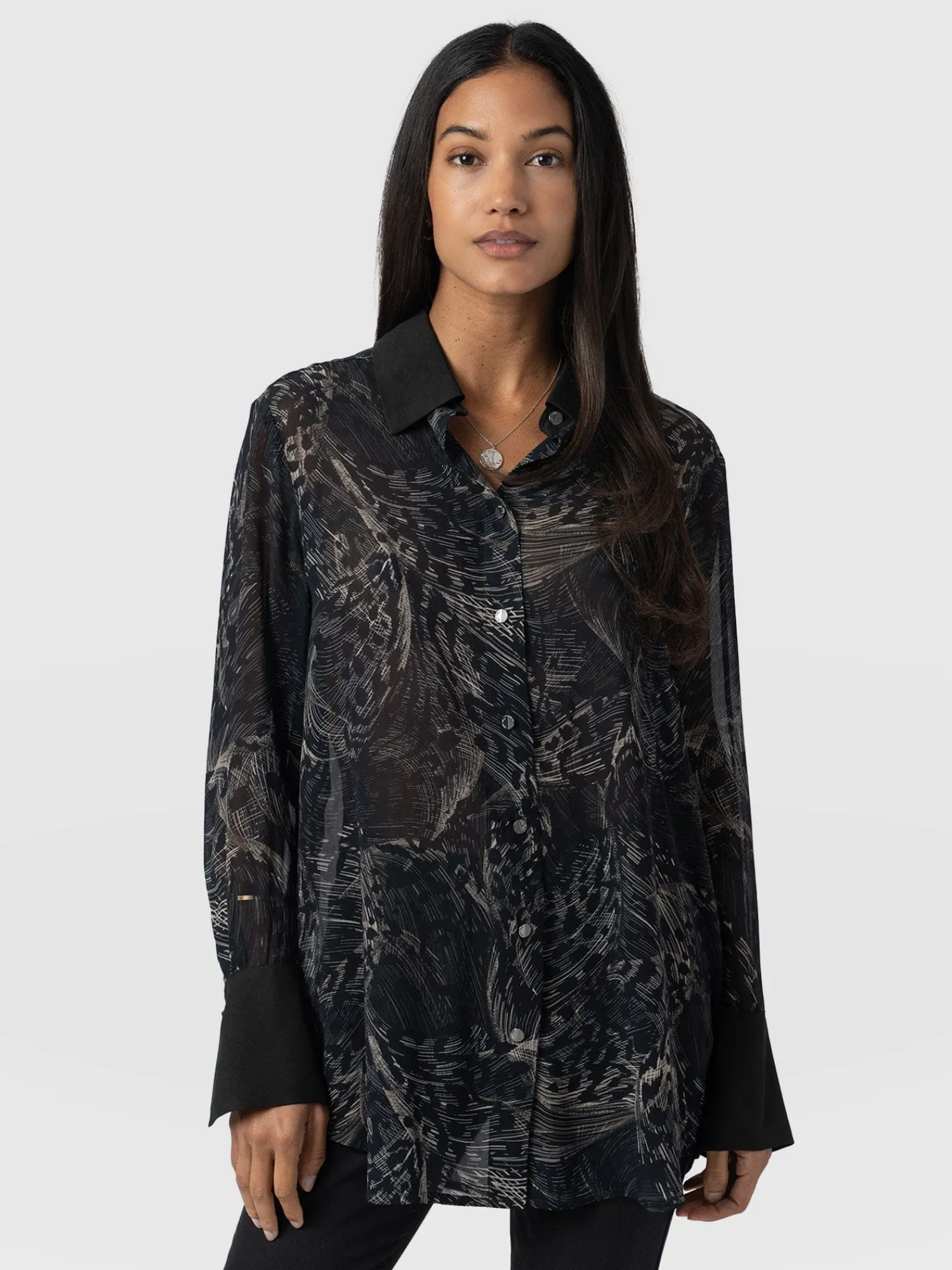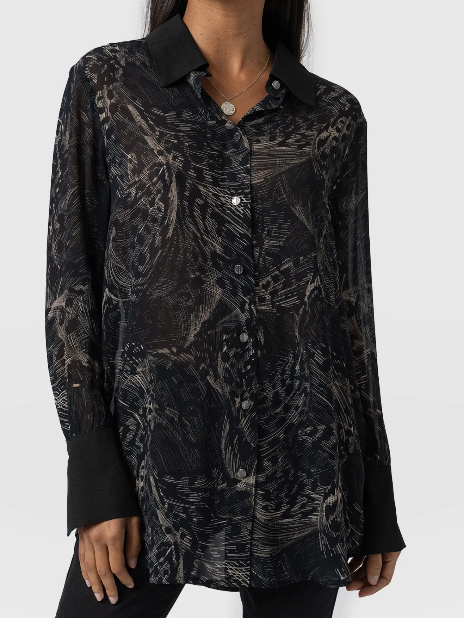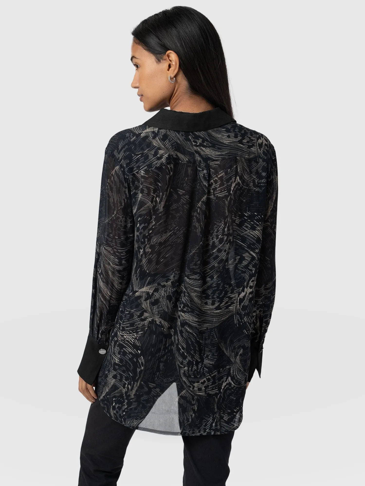 The Madison Shirt in Spot Feather is a capsule wardrobe must-have for creating timeless and elegant looks ready for any occasion. Our skilled artisans hand make this oversized style using a semi-sheer georgette fabric decorated with a feather print and trimmed with gunmetal buttons. Its relaxed silhouette is perfect for pairing with our Maeva skinny jeans and finishing with a pair of ankle boots for a chic and sophisticated look.