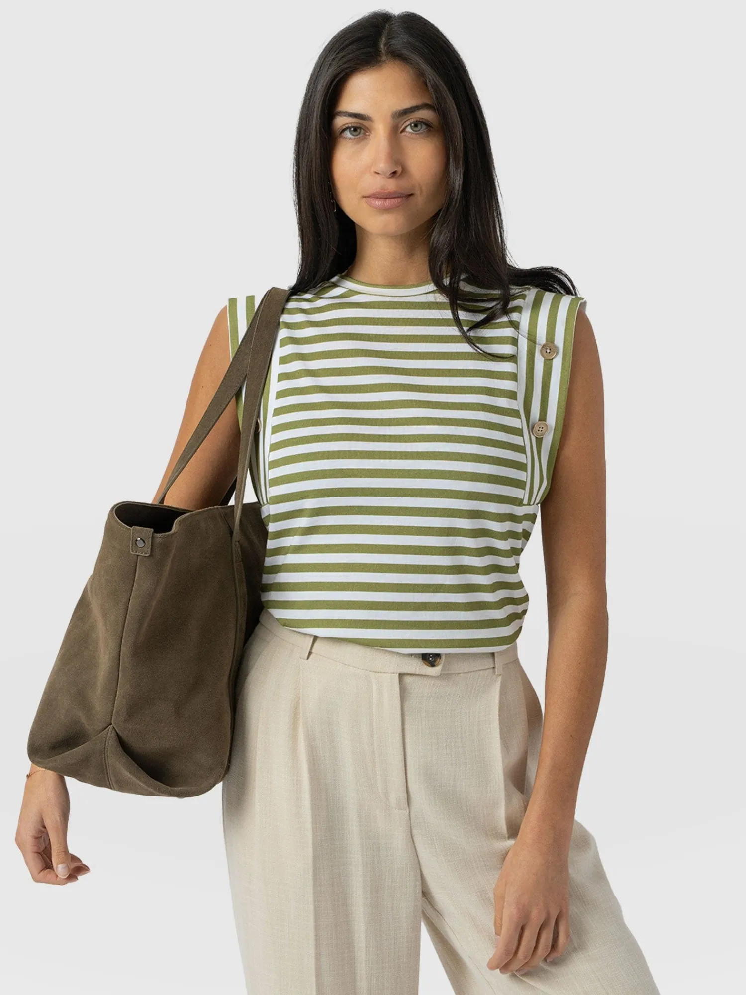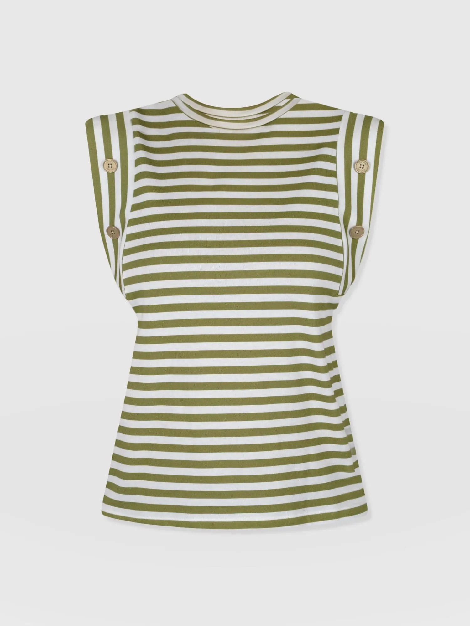 A staple T-shirt to add to your everyday collection, The Rowan Tee is a casual design made from soft and gentle cotton. It’s shaped to a relaxed fit with a sleeveless frame to add some edge to the classic crew-neck silhouette. At the sleeves, gold buttons trace up the sides for a playful touch. Pair yours with the Finsbury Pant or Wide Leg Jeans and your favourite sneakers for a comfortable and always-on-trend look.
