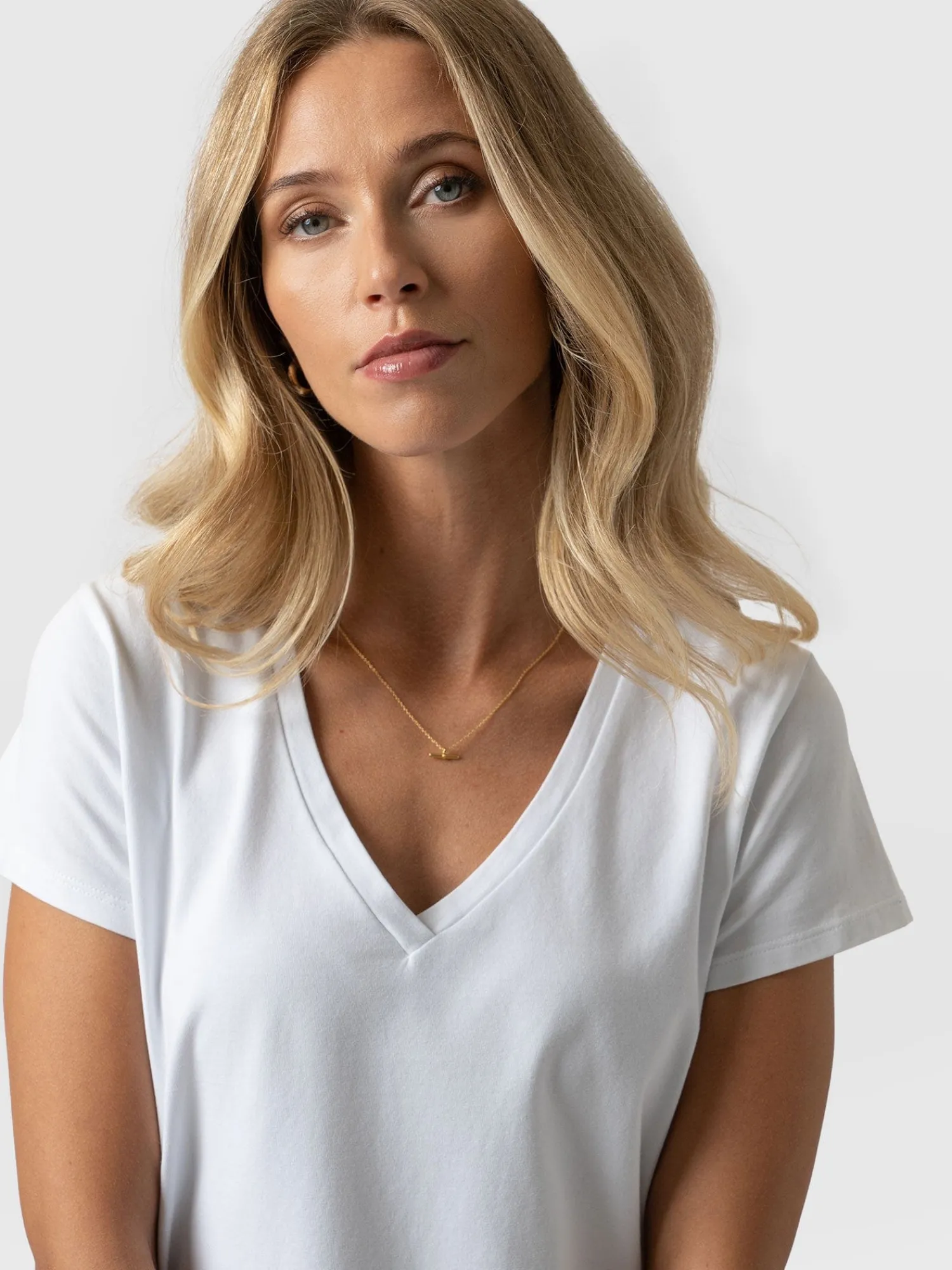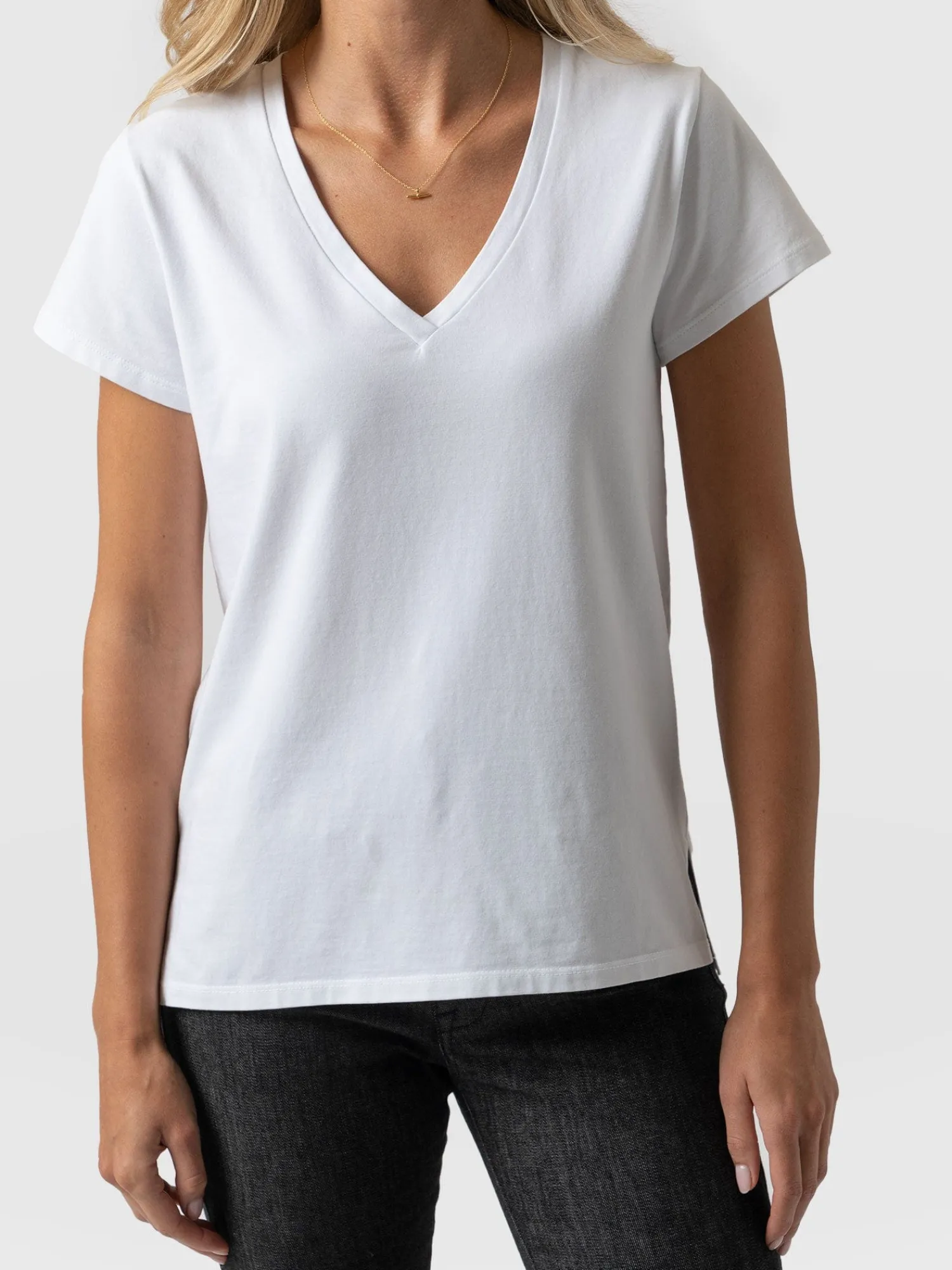 The apartment tee is a classic, v-neck t-shirt style made with the softest organic cotton and a relaxed, loose fit. Each style is finished by hand in our studios using a certified organic cotton that’s soft and smooth. Lightweight and comfortable, pair with any relaxed pant and use the side-slits for french tucks.